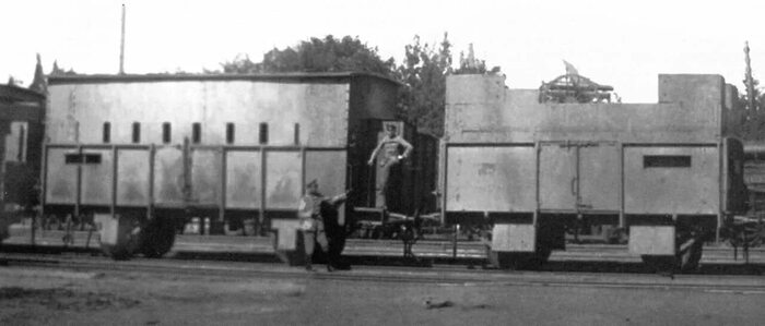 Слева пулемётный броневагон, справа артиллерийский