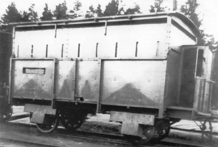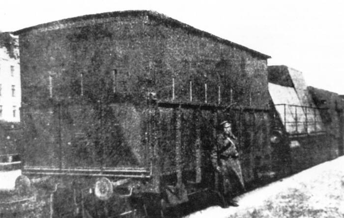 Бронированный полувагон с бойницами из состава бронепоезда 5-го Сибирского железнодорожного батальона. 1916 год. Хорошо видны амбразура для стрельбы из пулемета и бойницы для винтовок