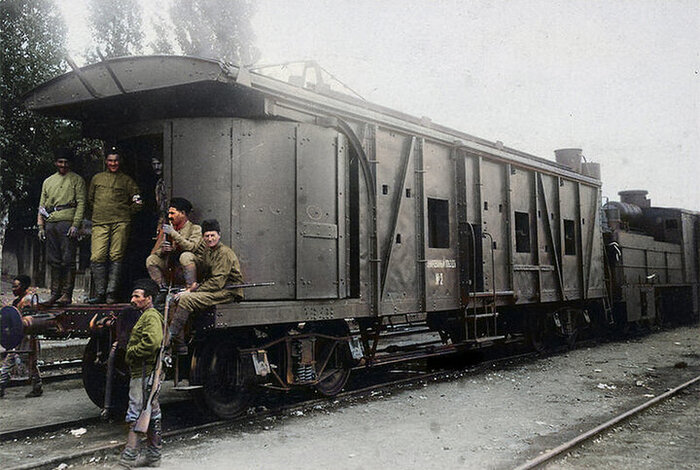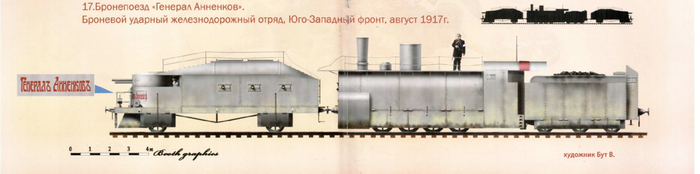 Итак мы на финишной прямой, осталось всего два бронепоезда (с оговоркой). Последние два БП, самые интересные, ибо представляют из себя вершину русской инженерной мысли, тех лет. "Генерал Анненков" - самый совершенный бронепоезд из всех 15, вступивший в эксплуатацию 4 октября 1915 года. Собрал и использовал бепо - 8-й железнодорожный батальон. Толщина листов обшивки паровоза составляла невероятные, для предшественников 20-мм, толщина брони вагонов от 10 до 20 мм, под листами стали 25-мм пробки и 20-мм войлока, что гарантировано останавливало любые осколки, которые каким-то образом пробили обшивку. Состоял Генерал Анненков из трёх частей, паровоза и двух одинаковых броневагонов, каждый из которых был вооружён: 8-и сантиметровой австрийской пушкой, 6-ю пулемётами Шварцлозе (фото есть в первом посте). Так же в этих вагонах были: рупорная, звонковая и телефонная связь с командиром состава. И по три люка, один на крыше, с отверстием для перископа и складывающейся лесенкой, а так же два люка в полу, всё для безопасной эвакуации. Крайне занятно: Генерал был построен таким образом, чтобы была возможность ходить из одного вагона в другой, и свободно передвигаться по самим вагонам, для бронепоездов России это была - инновация. Ещё одним нововведением была башня со смотровыми щелями в задней части бронепаровоза. А для управления всем этим добром нужно было всего лишь 53 человека, у того же Хунхуза численность экипажа составляла почти сотню рыл (94 человека). Этот Бронепоезд был настолько крут, что использовался вплоть до 1944 года.