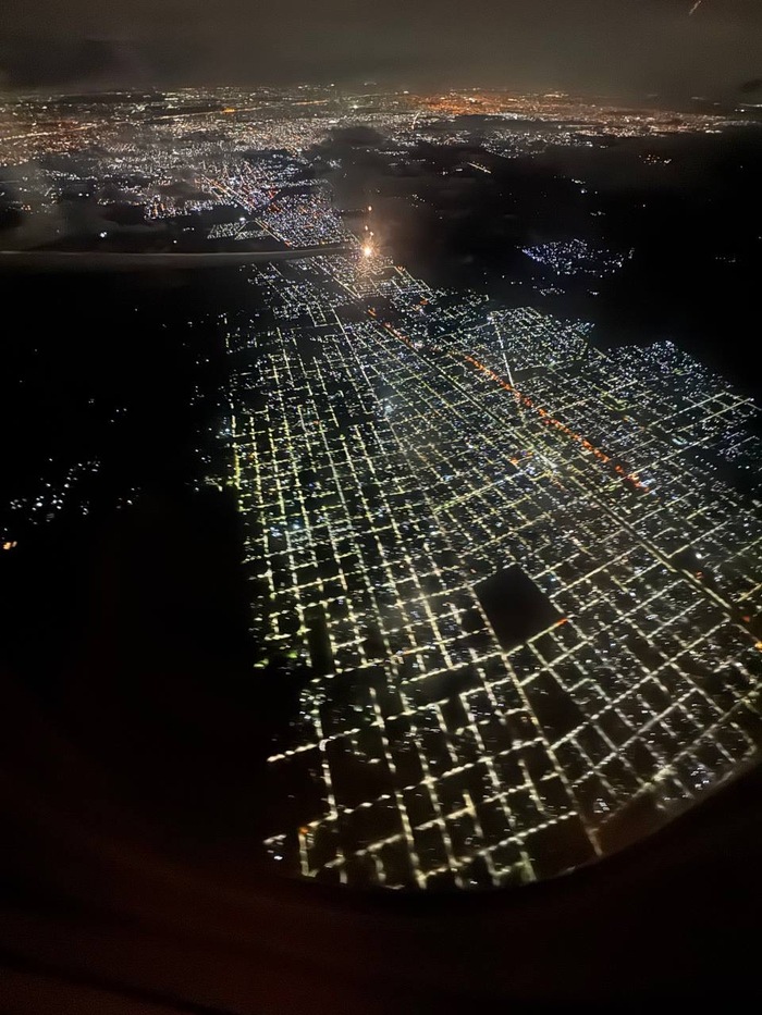 8 минут до Буэнос-Айреса. Приземляемся в кромешной темноте. Время — десять вечера. Под нами огромные светящиеся квадраты кварталов города, миллиарды огней, будто на черный бархат рассыпали бисер.