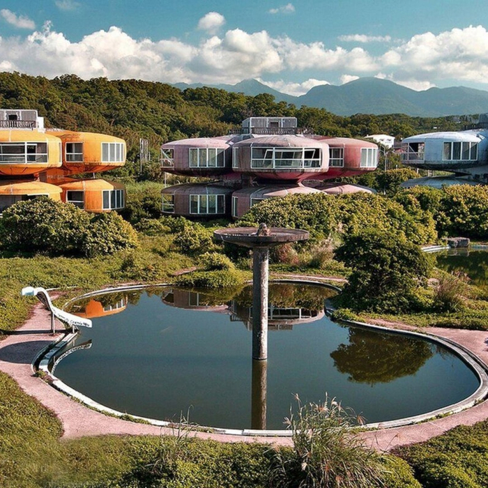 Футуристический комплекс из 60 домов в форме НЛО из прочного стекловолокна в округе Саньчжи, Синьбэй, Тайвань. Проект был нереализованным комплексом ультрасовременных домов для столичной элиты и богемы. В каждую из «тарелок» можно было подняться по изящной мраморной лестнице, а спуститься — прямо в океан или бассейн по водной горке со второго этажа.