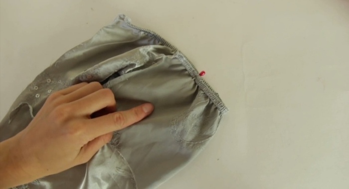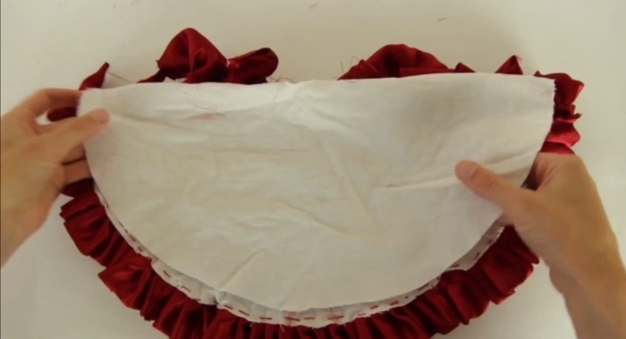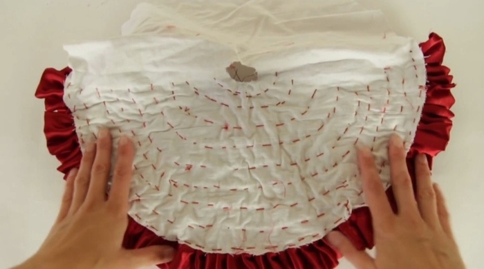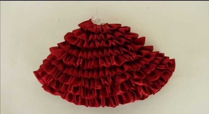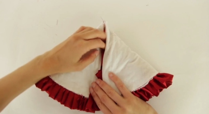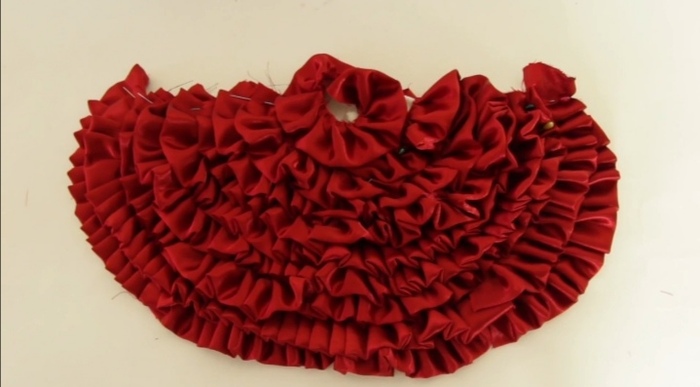 6. Складываем основу пополам и пришиваем к 1 половинке складки из атласной ткани, начиная с низу.