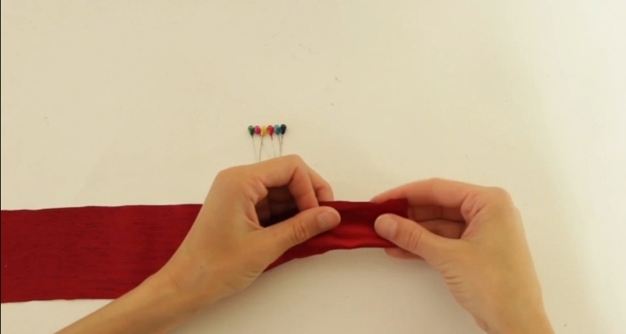 1. Атласную ткань нарезаем на полоски 8 см, складываем пополам.