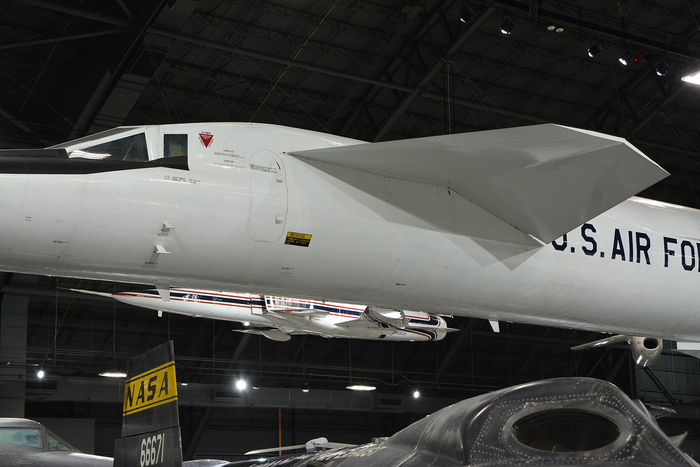 Бомбоотсек длиной в 9,1 метра располагался между изогнутыми каналами воздухозаборников. Вооружить самолет собирались ядерными бомбами и перспективными аэробаллистическими ракетами, разрабатывавшиеся специально для XB-70. Правда ни один из проектов ракет до финала не довели и никакого оборудования для применения вооружения ни на один из построенных самолетов так и не установили. Почему? Расскажу дальше.