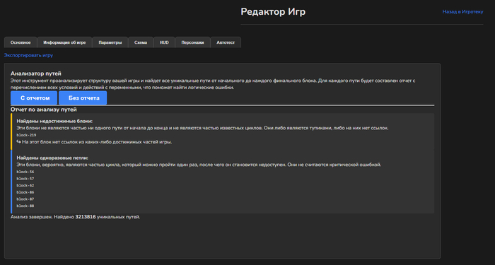 Тестировать игру вручную всё равно придётся и, скорее всего, много раз. Однако для того чтобы найти прям явные косяки, например, недоступные блоки или блоки, из которых вообще нет выхода, всегда лучше через автотест. Пока этот раздел еще совсем не идеален, но ключевые цели он выполняет, хотя некоторые циклы он может помечать ошибочно безвыходными.