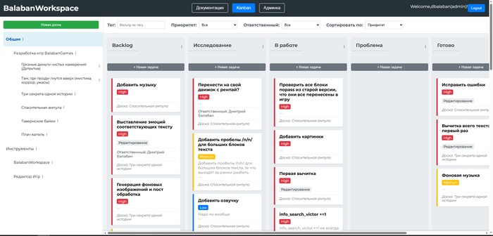 У меня всегда много проектов, которые ведутся параллельно, и всегда есть опасение, что сервис, в котором я его веду, закроется или у меня не будет бэкапа (привет, Кликап (бэкап был, но всё равно часть данных была утрачена)). Вот потому я решил для начала сделать себе то, с чем я всегда работаю независимо от проекта, компании и так далее: Документация и Задачи. Да, есть куча крутых сервисов, в которых всё супер доведено до ума, бла-бла-бла, и я с ними, естественно, работаю, где это необходимо. Однако для своих проектов я сделал себе свой инструмент — BalabanWorkspace. Всего с двумя активными разделами: Документация и Kanban. Они хранятся у меня, у меня всегда есть резервные актуальные копии — это моё.