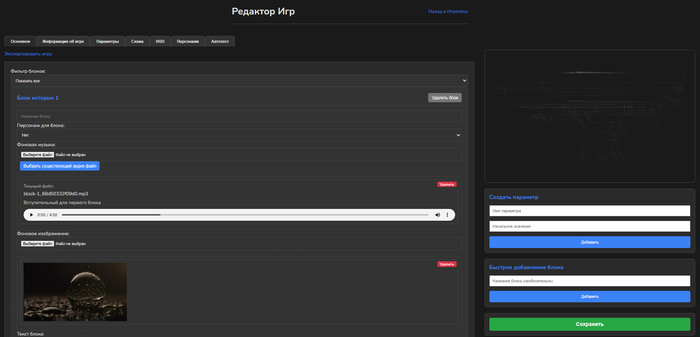 Нужен диалог — добавил блок, и вуаля. Захотел добавить новую фоновую музыку — да пожалуйста. А чтобы не мусорить, можно выбрать трек с понятным самому себе описанием. Вариант перехода от блока к блоку — так же графические элементы, выбирай, чего хочется: броски кубика, автопереход, с условием, сложным условием и так далее. С блоками текста можно выводить значения параметра через макрос, а хочется что-то по условию: например, параметр = 1 истина, то показать значение параметр_два, если ложно — параметр_три, и так же всё это в графическом редакторе. Подсказки на каждом этапе, разумеется, присутствуют: начал писать «пара...» — снизу уже показывается всё, что есть, начинающееся на «пара...». Картинки сразу заворачиваются в WebP формат. Персонажи, HUD и всё прочее — все графические элементы.
