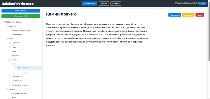 В документации я храню лор своих игр, собственно, документацию по проектам и, в целом, это не сильно отличается от основного функционала того же Yandex Wiki, Confluence и так далее. Разумеется, их функционал гораздо шире, но мне и не требуется он в полной мере. Разделение доступа (читать, писать, админ), двигать разделы в подразделы мышкой, редактор, который умеет в Markdown, и выгрузка всей документации в том же Markdown вместе со всей структурой и иерархией.