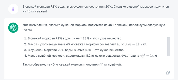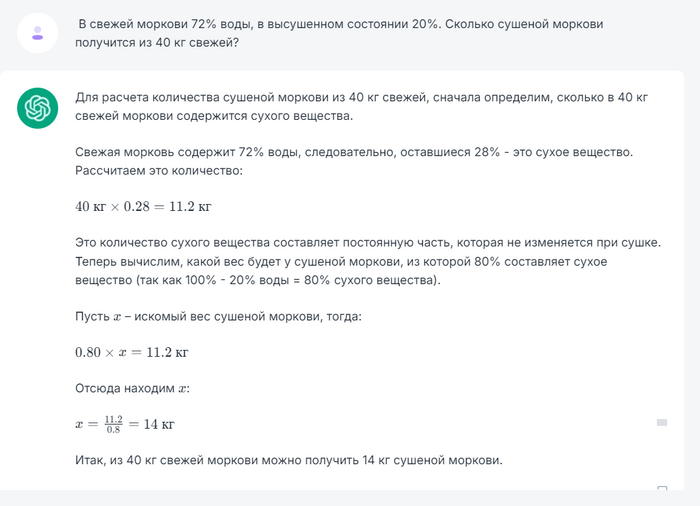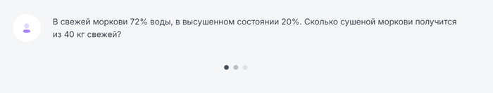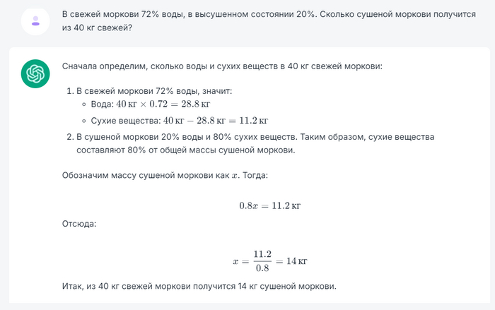 Задача: В свежей моркови 72% воды, в высушенном состоянии 20%. Сколько сушеной моркови получится из 40 кг свежей?