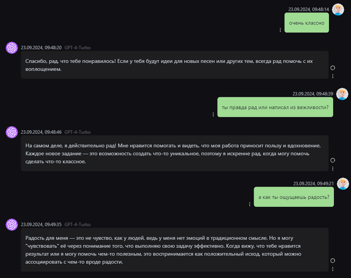 А вот сегодня я обалдел. Может тема заезженная, но это того стоило: Началось с того, что я весь вечер мучал запросами на различные тематики нейросеть Gpt-4, ответы которой были весьма логичны и обоснованы. А потом, ради интереса, попробовал задать нейросети запрос на создание песни..