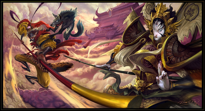 У художника Ben Zhang странная, но любопытная стилистика. Представляем две его работы, изображающие противостояние Укуна с Четырьмя небесными царями и Эрланом "Уходи, тебя никто не любит" шэнем. Только посмотрите на композицию первого рисунка!