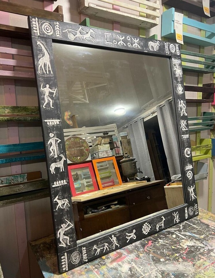 А теперь про декор. Для этого барбершопа мы вырезали на раме петроглифы — фигурки людей, животных, спирали. Сначала рисунок переносится на дерево, потом стамеской выбирается фон. Кто-то скажет: «зачем, если можно фрезером?» Можно. Но рука даёт совсем другую фактуру. Такое зеркало не спутаешь с фабричным — и это именно то, за что платят владельцы салонов.