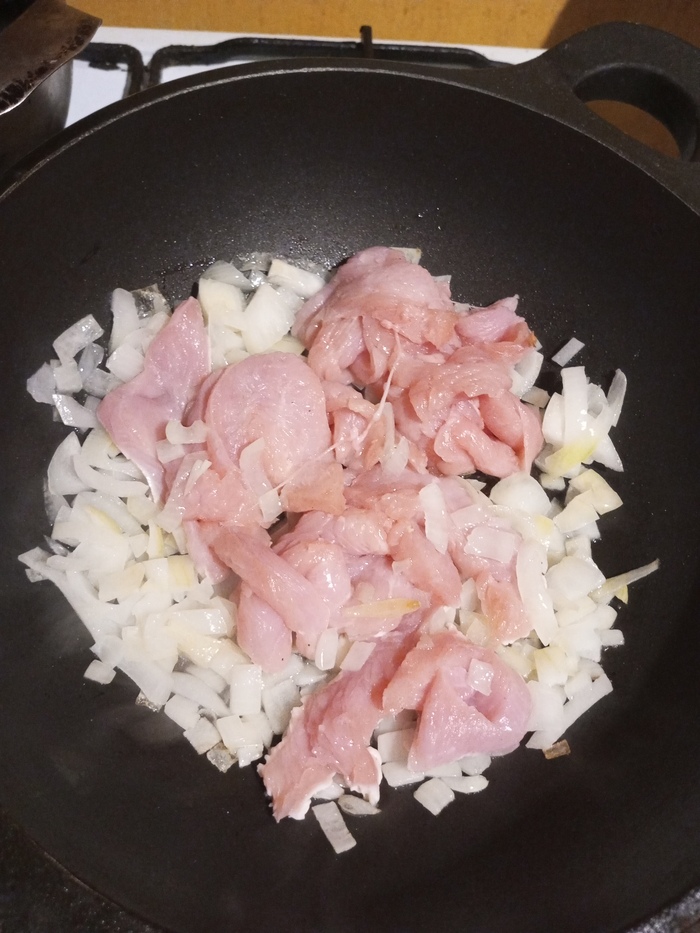 Раскаляем масло в казане, кидаем в него мясо, порезанное в половину спичечного коробка, обжариваем его до корочки и добавляем копченую грудинку, ее я порезал кубиками в 1см. Обжариваем минут 10 и добавляем лук, порезанный полукольцами ( я лук не люблю, поэтому перебиваю его на блендере), и морковь, перетертую на крупной терке. Моркови надо много, потому что она ужаривается и ее становится мало, обжариваем 5-7 минут, добавляем грибы, добавляем специи, лавровый лист, тмин, острый перец, смесь перцев, все перемешиваем.