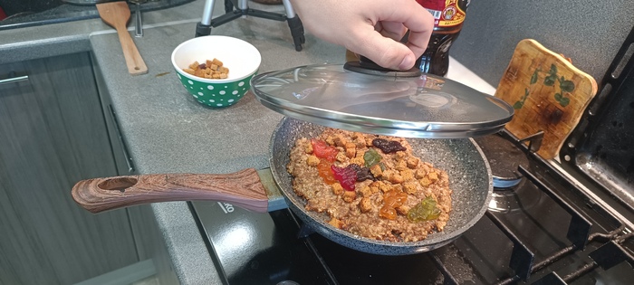 После этого сгребаем все это в одну сторону и выкладываем томатную пасту на дно казана, чуть обжариваем и всё перемешиваем. доливаем воды 250г, даем закипеть и выкладываем свежую капусту, а поверх нее, квашенную. Накрываем крышкой, убавляем огонь до минимума и даем протушиться 10-15 минут. Потом всё перемешиваем и на минимальном огне тушим 40-50 минут.