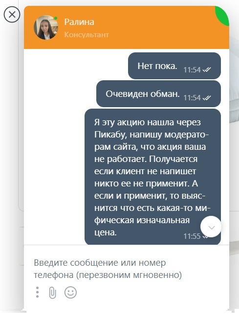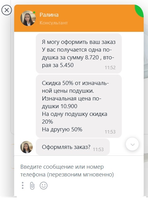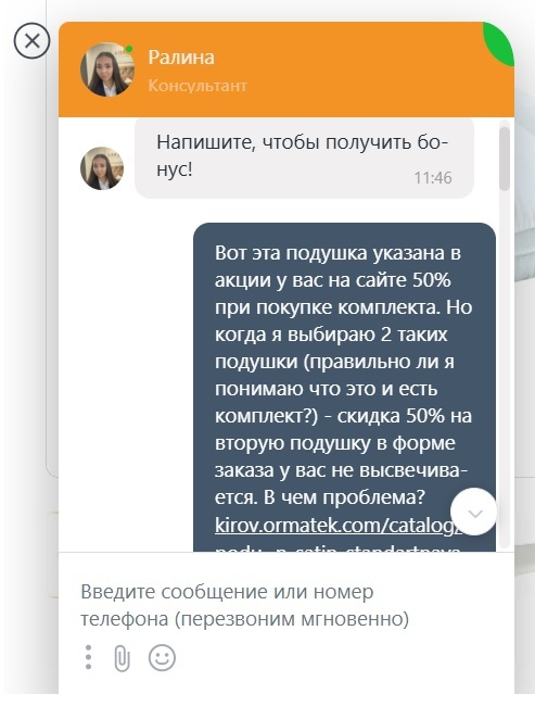 Собственно, из переписки все понятно. Акция, указанная у нас на Пикабу в соответствующем разделе и разрекламированная везде компанией Орматек - у них на сайте не работает автоматически в Корзине из-за каго-то мифического "сбоя". Но все мы взрослые люди и прекрасно понимаем, что никакого сбоя там нет, а есть вполне себе преднамеренное наебалово. Если не знаешь об акции, то купишь обе подушки по полной стоимости как миленький. Что конечно же магазину выгодно. А если узнал об акции, и мало того тебе хватило настырности докопаться до истины в живом общении с консультантом (а далеко не у всех ген настырности такого размера как у душнилы меня), то так уж и быть - ее тебе оформят в индивидуальном формате, из под полы как на рынке можно сказать, но и тут выяснится, что 50% скидки применяется на некую мифическую цену, которая конечно же нарисована самим продавцом от балды, и которая значительно выше реальной рыночной цены на данной продукцию.