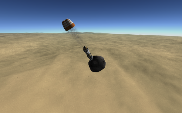 6. Не ставьте много парашютов, во-первых это не красиво, во-вторых у вас есть двигатели с небольшим запасом топлива, которого должно хватать для совершения мягкой посадки. Достаточно 2-4 парашюта, чтобы снижаться со скоростью 12-25м/с, а на высоте менее 100м. до поверхности включить на малой тяге двигатели и мягко сесть. Если сделать малую тягу не получается, то предварительно убавьте "Thrust limiter" в каждом двигателе. Для мягкой посадки ваша вертикальная скорость должна быть менее 6м/с (для версии 1.1.3. 7м/с), если же вдруг вы перелетели KSC и садитесь на воду, то лучше снижайте скорость до 5м/с для длинных ракет.
