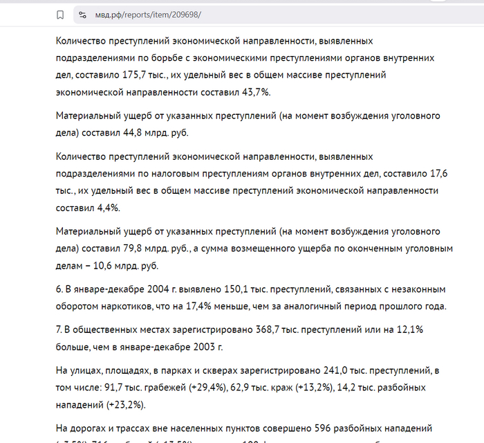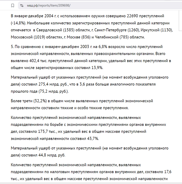 5. По сравнению с январем-декабрем 2003 г. на 6,8% возросло число преступлений экономической направленности, выявленных правоохранительными органами. Всего выявлено 402,4 тыс. преступлений данной категории, удельный вес этих преступлений в общем числе зарегистрированных составил 13,9%.