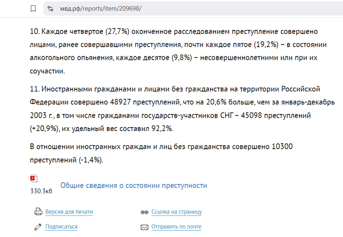 11. Иностранными гражданами и лицами без гражданства на территории Российской Федерации совершено 48927 преступлений, что на 20,6% больше, чем за январь-декабрь 2003 г., в том числе гражданами государств-участников СНГ – 45098 преступлений (+20,9%), их удельный вес составил 92,2%.