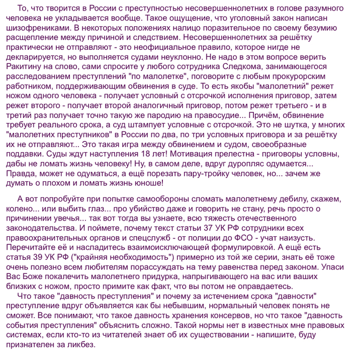 Мне нравится блог А.Ракитина о преступлениях, нравится его любовь к деталям, логика и сарказм. Захотелось поделиться его возмущением по поводу того, что иногда даже при совершенно ясной вине преступников наказать не удается: возраст, срок давности… и в довесок безнаказанность за лжесвидетельство.