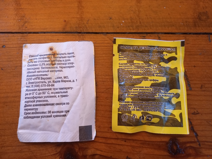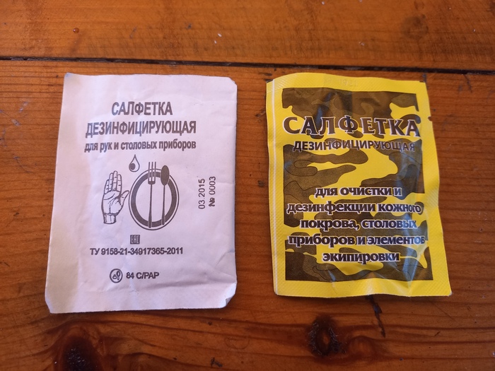 Так вот, бухать на головную возраст уже не позволяет, для нажора до основной готовки покупаю армейские сухпайки. И вот, нашёлся в закромах некоторый раритет. Салфетка дезинфицирующая, образца 2011 года, произведенная а 2015году. На фото ниже, сравнение её с салфеткой образца 2020 года. Как видим, материал стал значительно тоньше, но ни разу не дешевле.