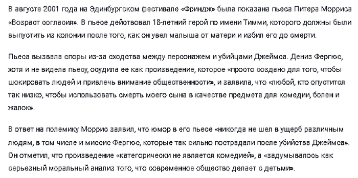 Вскоре после суда и после того, как судья рекомендовал минимальный срок наказания в восемь лет, лорд Тейлор из Госфорта, лорд-главный судья, рекомендовал, чтобы два мальчика отсидели минимум десять лет, что дало бы им право на освобождение в феврале 2003 года, в возрасте 20 лет. Редакторы газеты The Sun передали министру внутренних дел Майклу Ховарду петицию, набравшую почти 280 000 подписей, с просьбой увеличить время, проведённое обоими мальчиками под стражей. Эта кампания оказалась успешной, и в июле 1994 года Ховард объявил, что мальчики будут находиться под стражей как минимум пятнадцать лет, а это означает, что вопрос об их освобождении не будет рассматриваться до февраля 2008 года, когда им исполнится 25 лет.