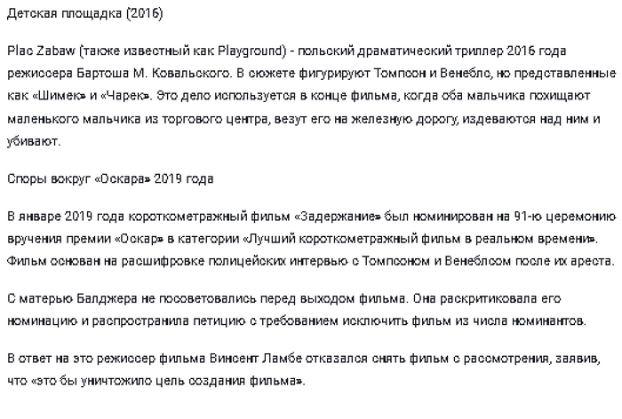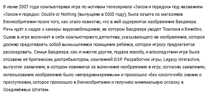 Некоторые британские бульварные газеты утверждали, что нападение на Балджера было инспирировано фильмом «Детская игра 3», и ратовали за ужесточение правил, касающихся «видео-безделушек». В ходе полицейского расследования выяснилось, что фильм Child's Play 3 был одним из фильмов, которые отец Венеблса брал напрокат за несколько месяцев до убийства, но не было установлено, что Венеблс когда-либо смотрел его. В одной из сцен фильма показано, как злобную куклу Чаки обливают синей краской во время игры в пейнтбол. Детектив из Мерсисайда сказал: «Мы просмотрели около 200 фильмов, взятых напрокат семьёй Венеблс. Некоторые из них вы или я не хотели бы видеть, но не было ни одной сцены, ни одного сюжета или диалога, где можно было бы нажать на кнопку «Стоп» и сказать, что это повлияло на мальчика, чтобы он пошёл и совершил убийство». Инспектор Рэй Симпсон из полиции Мерсисайда сказал: «Если вы собираетесь связать это убийство с фильмом, то с тем же успехом вы можете связать его с „Детьми железной дороги“». Закон об уголовном правосудии и общественном порядке 1994 года уточнил правила доступности некоторых видов видеоматериалов для детей.