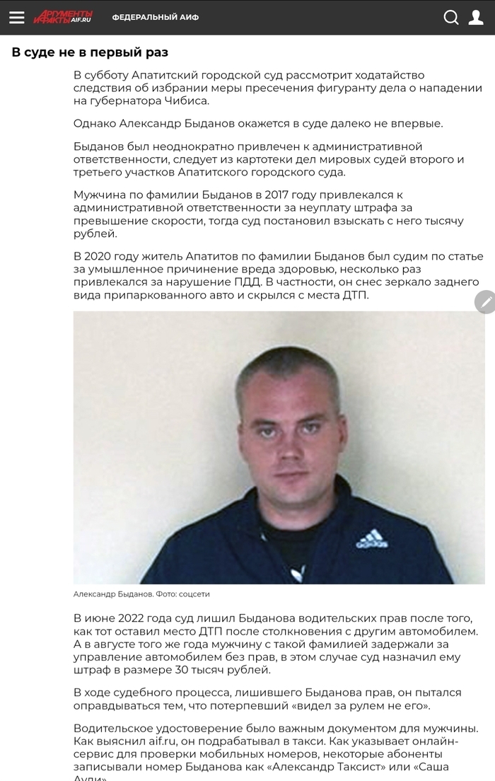 В материалах 2 и 3 судебного участка города Апатиты содержится информация о неоднократном привлечение Александра Быданова к административной ответственности за покидание места ДТП, за езду без прав и за отказ оплатить штраф.