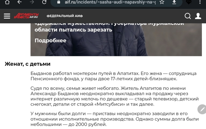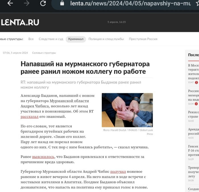 Не так давно Мурманскую область потрясла одна нелицеприятная новость. 04 апреля в г. Апатиты после встречи с жителями города на губернатора Мурманской области Чибиса А.В. напал неизвестный и удар его ножом. Нападавшего ранил и задержал сотрудник Росгвардии. В качестве мотива к нападению называют голоса в голове и личную неприязнь к губернатору (хотя с губернатором преступник не был знаком лично). При чём тут, собственно, АО "РЖД"?