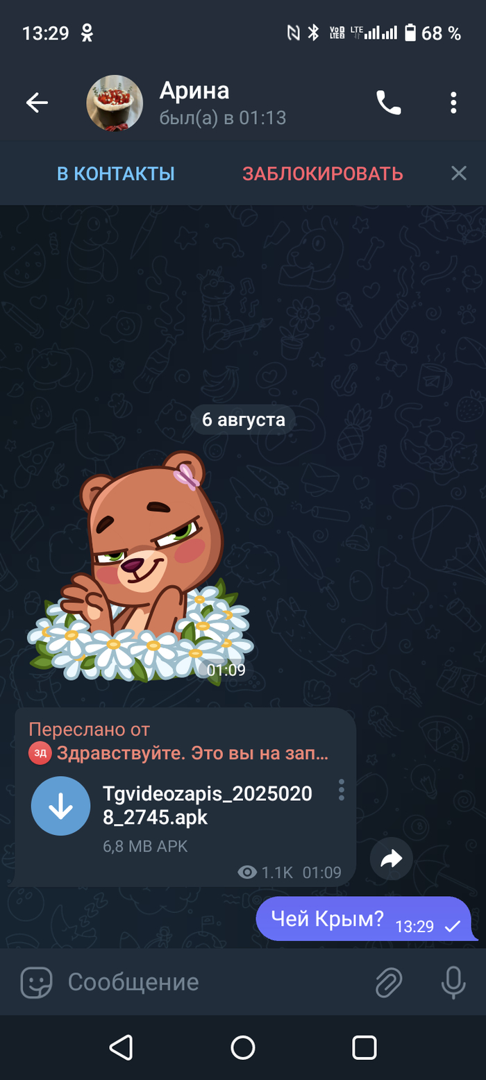 На днях получил вот такое незамысловатое сообщение в Телеграмме, конечно это не первое подобное сообщение, впоследствии после вопроса про Крым, понеслась перепалка, но отличие этого сообщения его от других в прикреплённом файле. Дело собственно в чер, рассчёт идёт на то, чтобы человек тыкнул на файл и скачал его, расширение файла имеет формат "APK", оно же является приложением для Андроид, то есть после скачивания файла, телефон либо автоматически установит приложение (если дано разрешение), либо запросит его установить, после установки мошенник на другом конце получает полный доступ к Вашему телефону, пароли, фото, контакты и прочие радости. Ну а теперь сама соль поста, друзья, прежде чем скачать файл присланный от неизвестного контакта, а иногда и известного, ознакомьтесь с его расширением, а лучше просто заблокируйте.