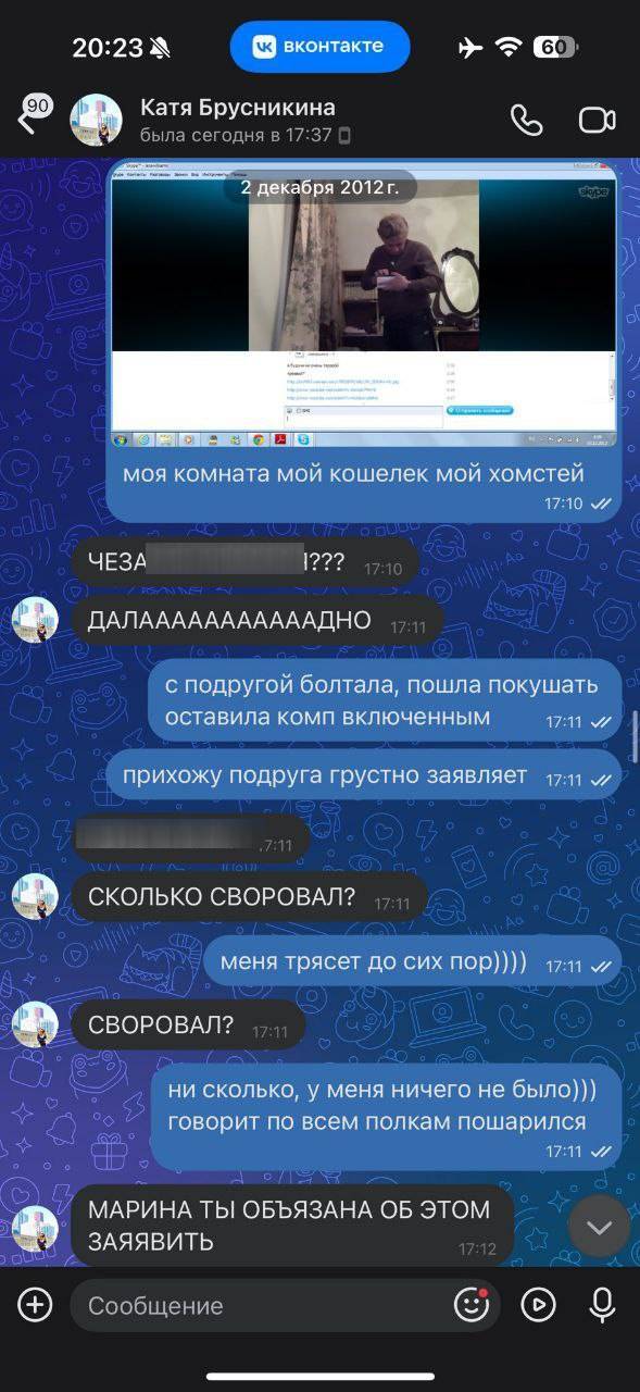 Несколько раз она оставляла включенной камеру Skype в момент, когда уходила в душ. На обратной стороне за ситуацией в комнате следила ее подруга. Мужчина входил в помещение и проверял все полки, а также нюхал вещи девушки. В доказательство Марина приложила несколько скринов с камеры в комнате.
