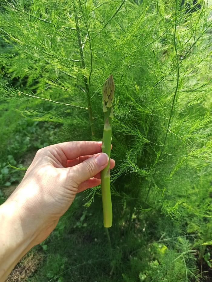 А вот и она, королева моего сада. Я делала про нее пост в прошлом году Очевидное невероятное Тогда у меня еще были маленькие редкие кустики и тонкие росточки. В этом году уже вот. Но я пока ее берегу и массово не срезаю. Оставлю на следующий год, когда все кусты войдут в уверенный рост и все спаржинки будут как на этом фото.