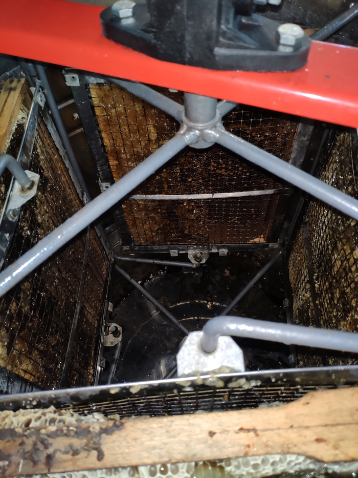 Пытались засунуть их аккуратно в пчельник, чтобы были без пчел. Ерунда, а не идея. Любой зазор в двери есть? Есть, значит пчела уже залетела. Пришлось заходить с рамками с пчелами и потом их внутри перебить, кто залетел, потому что работать над медом там невозможно, если летают пчелы. Дальше пошло распечатывание сот, мы конечно не совсем правильно делали, завтра уже сделаем нормально. Нож + кипяток вечный и тогда нормально снимается, но даже так смогли кое-как их вскрыть. Ещё один укус в шею, припухло, но уже начинаю привыкать (какой-то мазохизм). Все, загружаем распечатанные в медогонку и крутим, и слушаем шлепки меда об медогонку, каеффф.