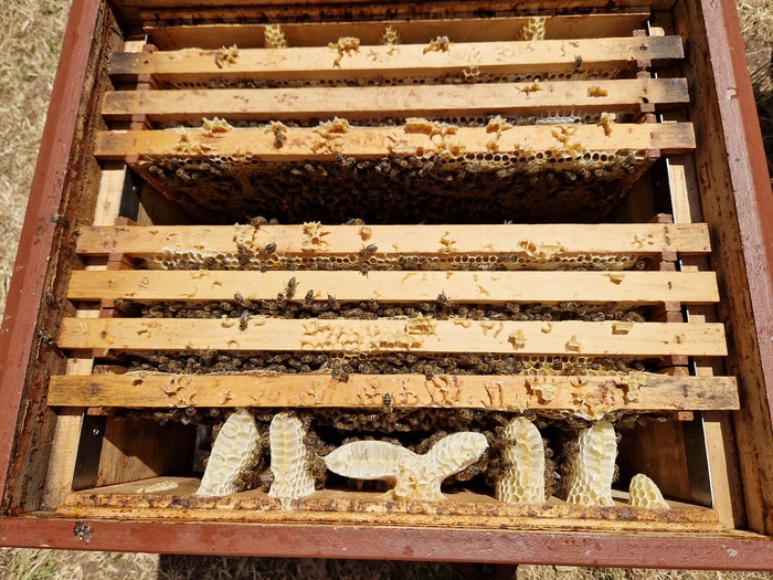 А что будут делать пчелы, если поселятся в пустом улье? Да то же самое, что делали всегда - начнут строить соты "природным" способом - "языками", цепляя их к горизонтальным или вертикальным поверхностям. Как на нижней части фото. Конкретно тут - это не забывчивый пчеловод не поставил рамку, а так задумано, потому что тут, в Триздофе, и даже на примере конкретно этого улика, обучают пчеловодов, поэтому тут много всякого, чего на обычной хорошей пасеке не встретишь. Ибо для хорошего обучения нужны наглядные пособия, ну а тут уж - куда нагляднее?