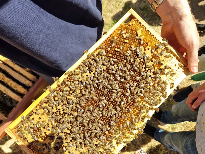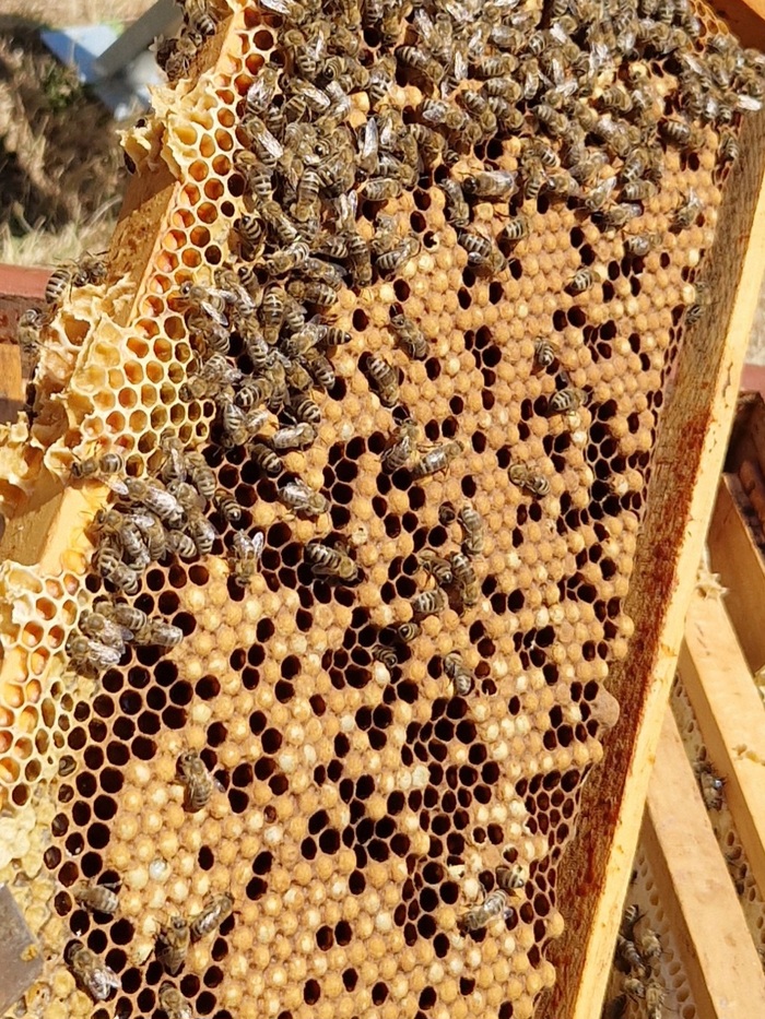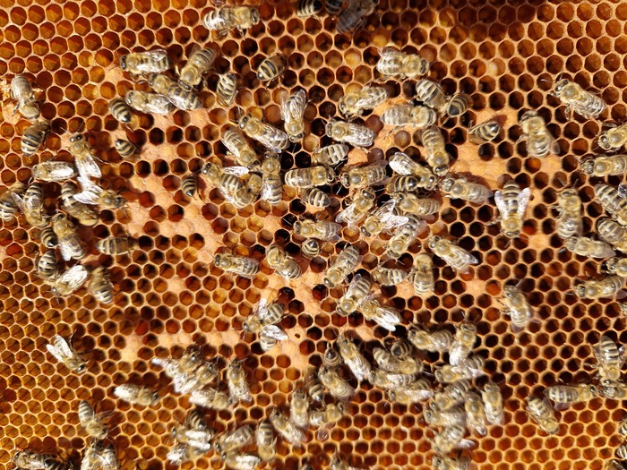 А вот на следующей фотке, если я не ошибаюсь, видны и ячейки с "женским" расплодом, и открытые медовые соты (жёлтые, слева вверху), и уже запечатанные медовые - в нижних углах. Если накосячил - просьба поправить меня.