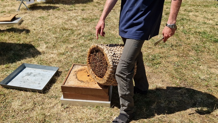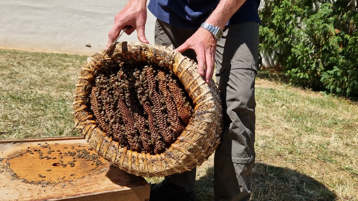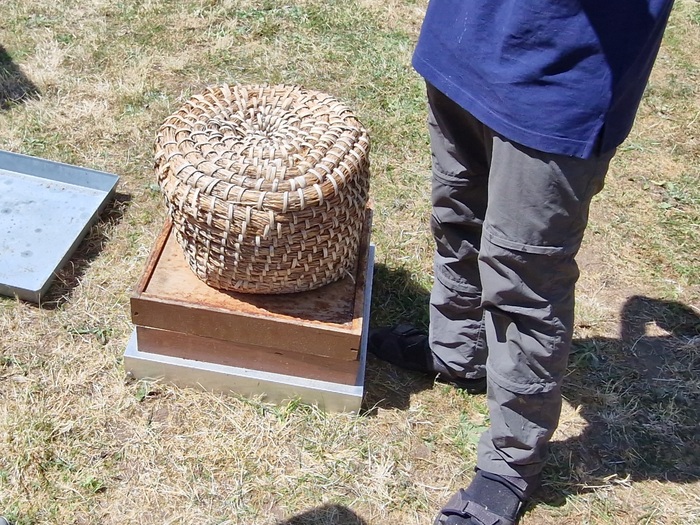 во-первых - вот так выглядели старые ульи, по крайней мере в Германии. Короб, сплетенный из ржаной соломы (потому что она длинная, метра полтора-два может быть). До сих пор широко используется в качестве символа профессии. На данный момент рассматривается как "альтернативный" метод содержания пчел. Собственно по этой причине и есть тут, в учебном центре.