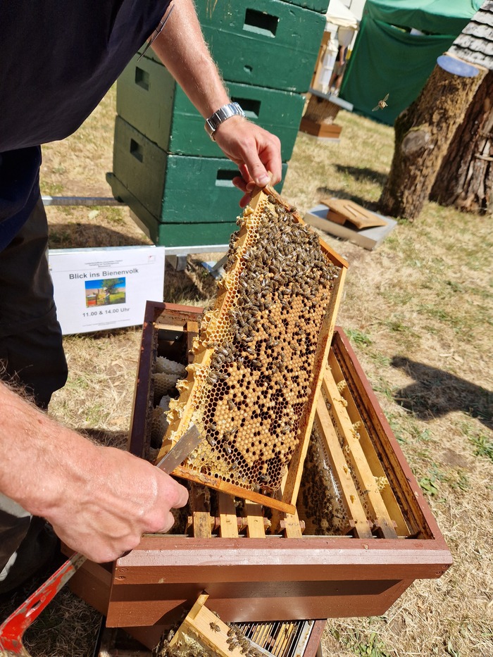 Проводилась такая "экскурсия" дважды за день, слушателей было человек 10 взрослых, плюс несколько детей. Пчёлки не кусались от слова совсем, даже при том, что дымарь не использовался. Рамки можно было хоть в руки брать - все разрешалось, пояснялось, а для детей - так рассказчик даже приседал, чтобы было лучше видно.