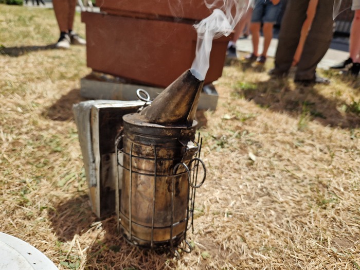 Его величество - дымарь. Обязательный инструмент любого пчеловода. Суть - делает дым. Задача - напугать пчел, чтобы они подумали что все пропало, лес горит, сгорит и хата, пора делать ноги. И прихватить с собой самое нужное - хавчик. Соответственно пчёлки всасывают в себя обратно свою отрыжку, ну, обычно ее медом называют. Причем берут сколько могут утащить, не щедя живота своего. Следствием этого становится то, что пчёлки не могут согнуться, животик то полон, а соответственно и ужалить тоже не могут. Вот поэтому дымарь и делает пчел "безопасными"