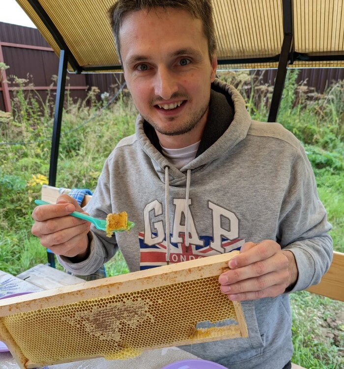 Мёд в первый сезон я не откачивал - пчёлы принесли крайне мало, буквально по паре полностью запечатанных магазинных рамок. Тем не менее, у меня был свой собственный мёд!