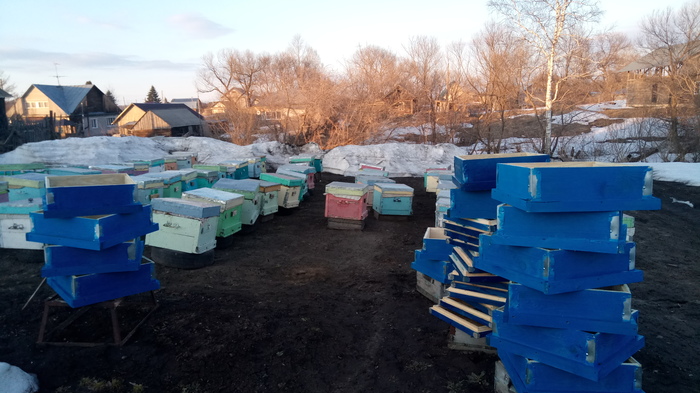 Первое очистка точков от снега. И выставка пчел. Делее очистительный облет. Т.к. полгода они только ели. Соседи предупреждаются, чтобы не сушили вещи на улице и машины убираются в гараж...