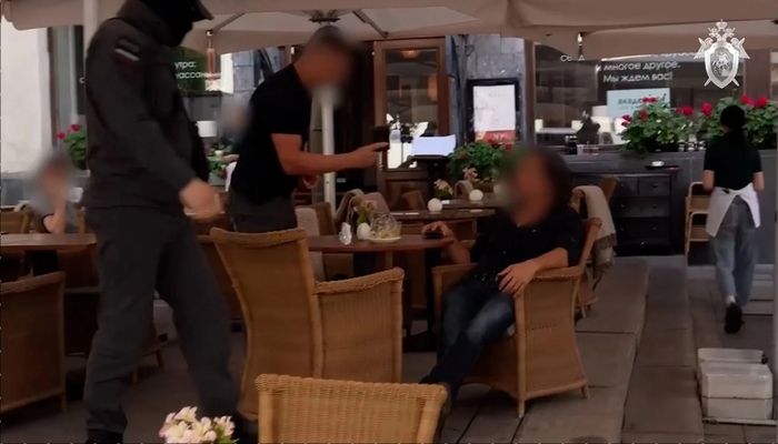 На видео, опубликованном Следственным комитетом, видно, как сотрудники службы безопасности арестовывают мужчину в кафе в Москве и препровождают в военный фургон.