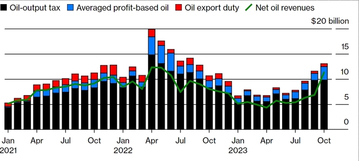 Тем не менее, доходы России от ее основных налоговых источников нефтедолларов почти удвоились в период с апреля по октябрь. Чистые доходы России от продажи нефти в размере 11,3 млрд $ в октябре составили 31% от общих чистых доходов бюджета страны за месяц, согласно расчетам Bloomberg, которые основаны на данных министерства финансов России, но не учитывают поступления от налога на прибыль. Это был самый высокий показатель с мая 2022 года и превысил любой отдельный месяц за год до вторжения в Украину, что первоначально вызвало огромную волатильность экспорта страны.