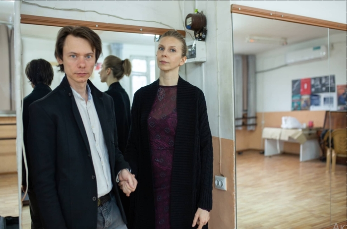 Пара сидит в большом репетиционном зале, вокруг них стоят старые чемоданы без колесиков, у стены советский письменный стол, реквизит для очередной постановки.