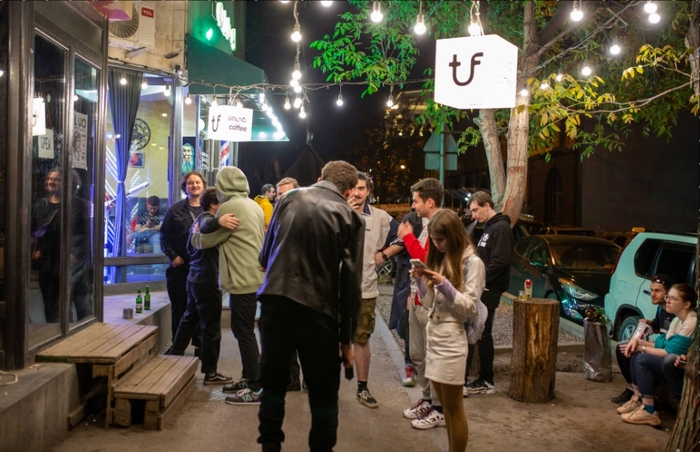 Первое часовое место встречи русских в Ереване - кафе Tuf. Сейчас приезжает так много людей, что его нужно расширять. Там забивают, сваривают, валяются сверлильные станки, на полу перевернуты зеленые пивные ящики в качестве табуретов для разнорабочих. Tuf Club в настоящее время превращается в Tuf House, расположенный на 3 этажах. Во время короткой паузы в шуме владелица, сбежавшая в Ереван из Санкт-Петербурга, говорит, что бар больше не предназначен для того, чтобы быть русским баром только для русских. „Мы живем в Армении среди армян, которые приняли нас так дружелюбно“, - говорит она. „Как будто мы близкие родственники“.