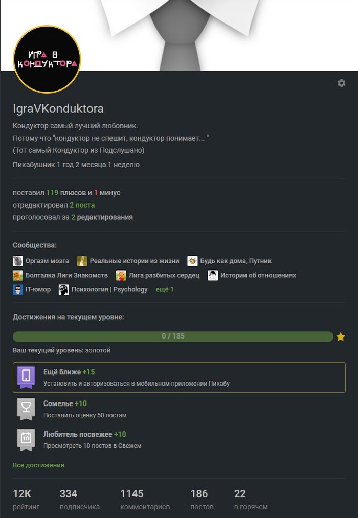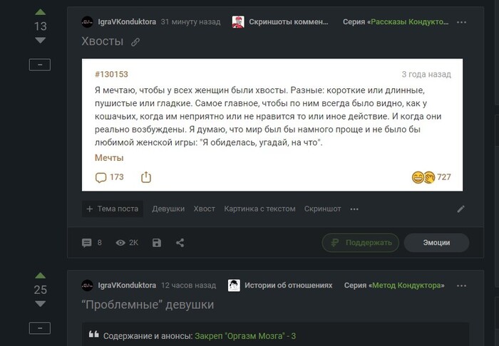 Закреп "Оргазм Мозга", Закреп "Оргазм Мозга" - 2, Ода минусаторам, Продолжение поста «В чем выгода для Кондуктора?», Продолжение поста «Мастер интриги», Не стреляй в Кондуктора, Первая годовщина, Обращение к модераторам [Есть ответ], Ответ Oppai.Nezumi в «Миссия Кондуктора», Открытое обращение к модераторам! [Есть ответ], "Обе белые", Коричневая жизнь, Несостоявшийся спор на 50 000 руб, Разговор двух пикабушников, Спор по спору, Завершение конкурса "Алло! Мы ищем таланты...", Новости от Кондуктора 03.03.2023, Новости от Кондуктора 10.03.2023, Новости от Кондуктора от 17.03.2023, Новости от Кондуктора 24.03.2023, Новости от Кондуктора 31.02.2023