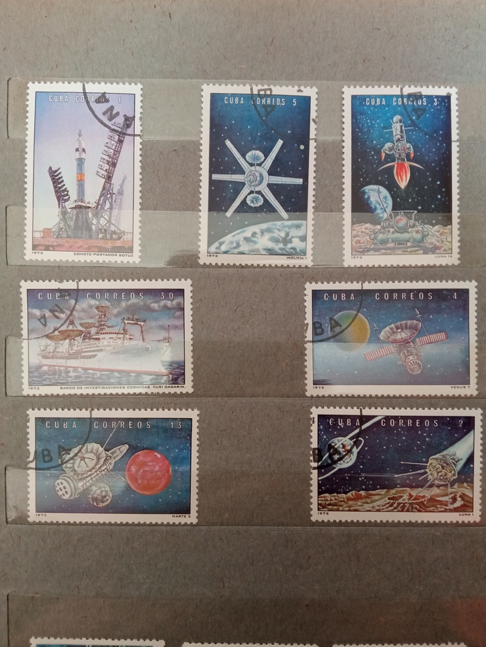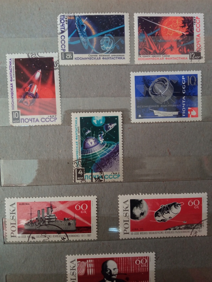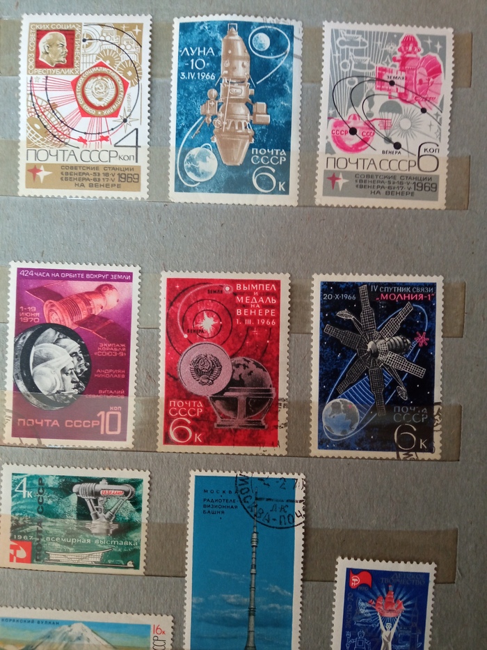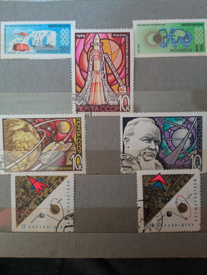 Вспомнил про детское увлечение филателией, нашел старый кляссер и сделал фото марок космической тематики.