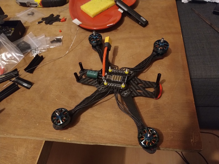 Дальше подкидываем моторы на регуль. Воообще люблю завести провода вокруг болтов и подпаять из нутри, но так как цель максимальное облегчение, то каждый сантиметр провода на счету. Дальше кондюк. Low ESR электролитический 1000мкф 35в. Здоровенный сссука!) *мужик_с_луковицей.jpg*