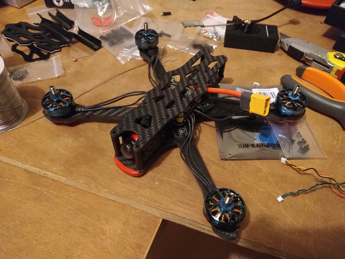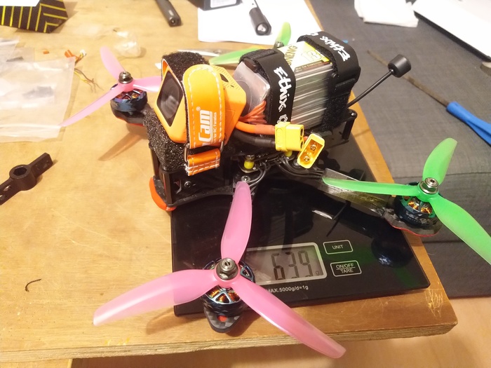 Фууххх.. Вроде ничего не забыли. Скручиваем всё вместе, убираем провода под защиту, наводим красоту. Цепляем липучки, камеру, батарейку, пропы.. Финальное взвешивание..
