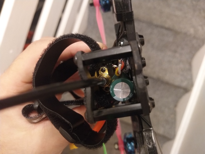 Сам приёник на двусторонний скотч в термоусадке приклеил рядышком с кондюком. Держится на мертво. Антенны вывел за нижнюю сторону луча, ближе к мотору, чтоб как можно дальше от карбона, который хорошо экранирует радиоволны.