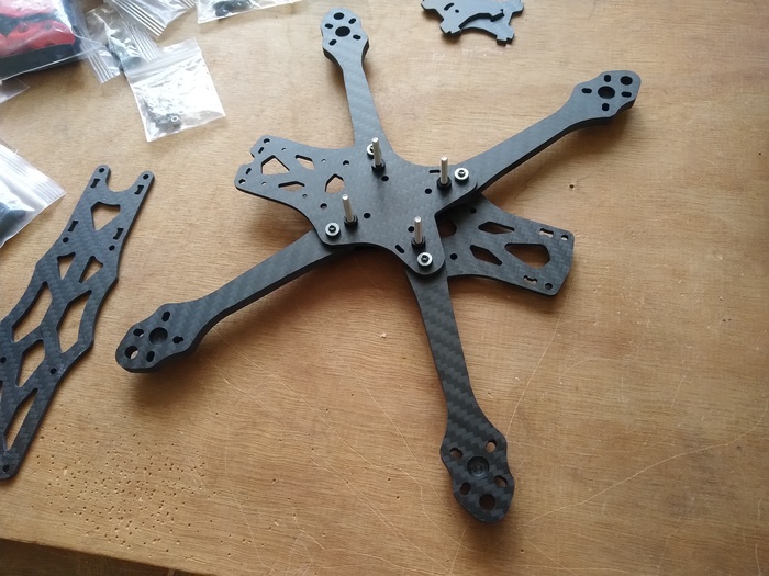 На этом этапе, даже чуть раньше, перед тем как поставить лучи, лучше прмерить высоту болтов на которых будет крепится стак электроники. Комплектные с рамой мне оказались котоковаты, а коплектные от полётника - длинноваты. Подобрал из наличия из того что дома было, хотя можно было алюминиевые из комплекта пильнуть и пару грамм сбросить. Сделать это надо до установки лучей, так как эти болты не проходят на сквозь раму, а остаются между лучей и пластиной. Потом чтоб поменять, придётся разбирать полностью. И по хорошему, затянуть эти болты демферными гайками, ведь если раскрутятся, то к обратной стороне, чтоб придержать отвёрточкой, подобраться уже не выйдет. Но так как я упираюсь в высоту стака, накрутил нейлоновые дистанцеры, самые узкие что были из комплекта полётника.