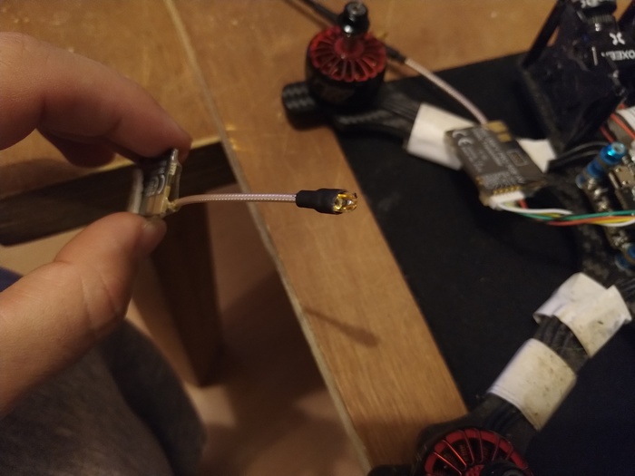 Как то однажды зацепился антенной в полете и оторвало её с куском коннектора) Да всё бы ничего, только передатчик шпарил в этот момент на 800mv и ему чтоб сгореть хватило секунды другой. Кое как без антенны долетел, картинка сыпалась просто в 95% статики. На нем даже термоусадка местами расплавилась. Поменял pigtail, но картинка так и не пришла, ладонь между передатчиком и приёмником полностью выключает картинку. Труп.